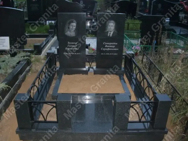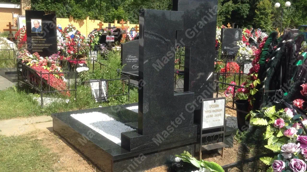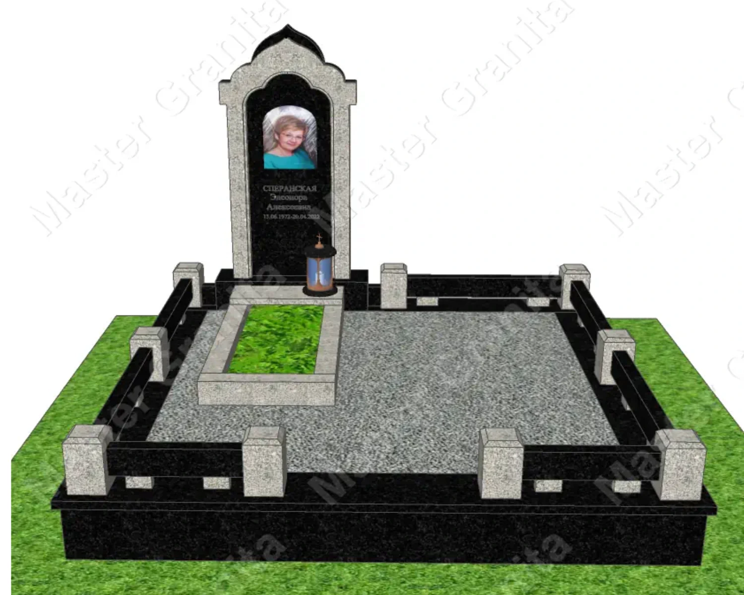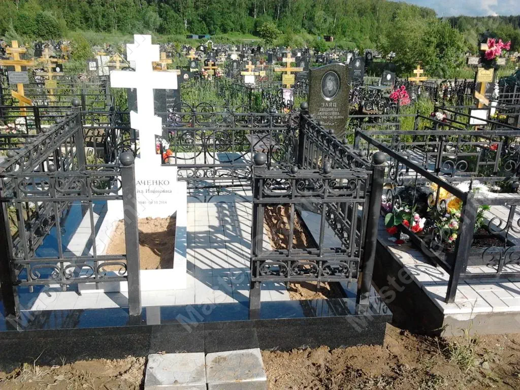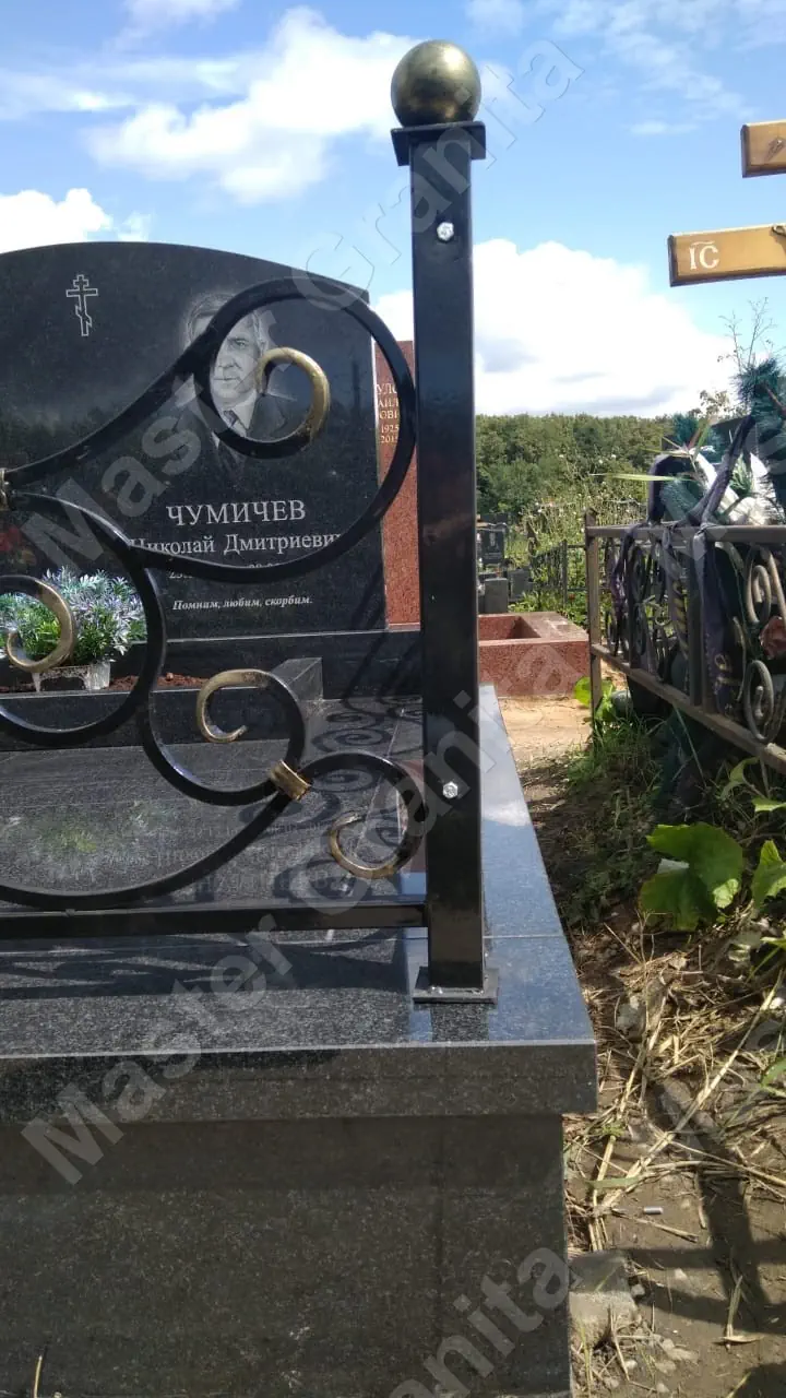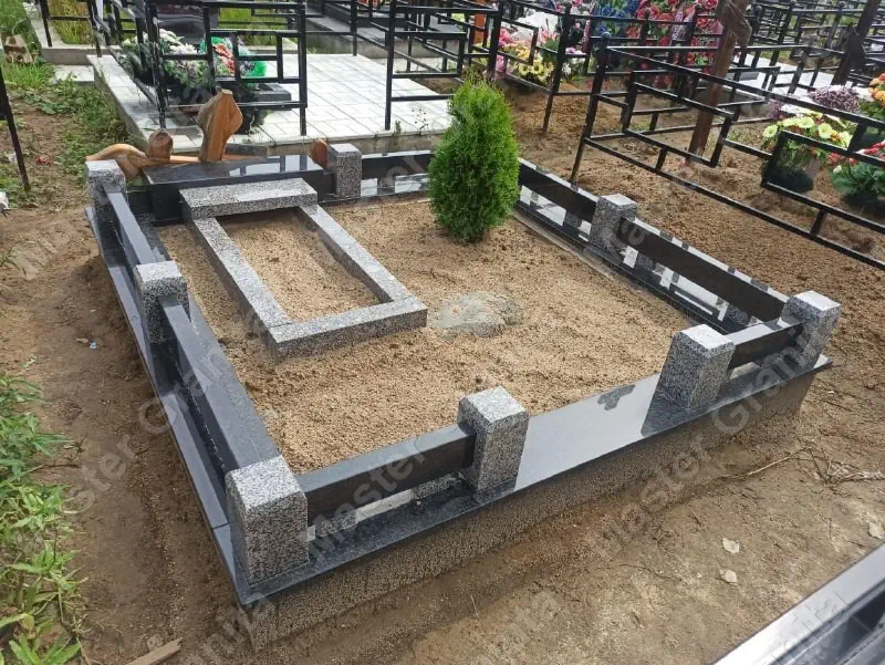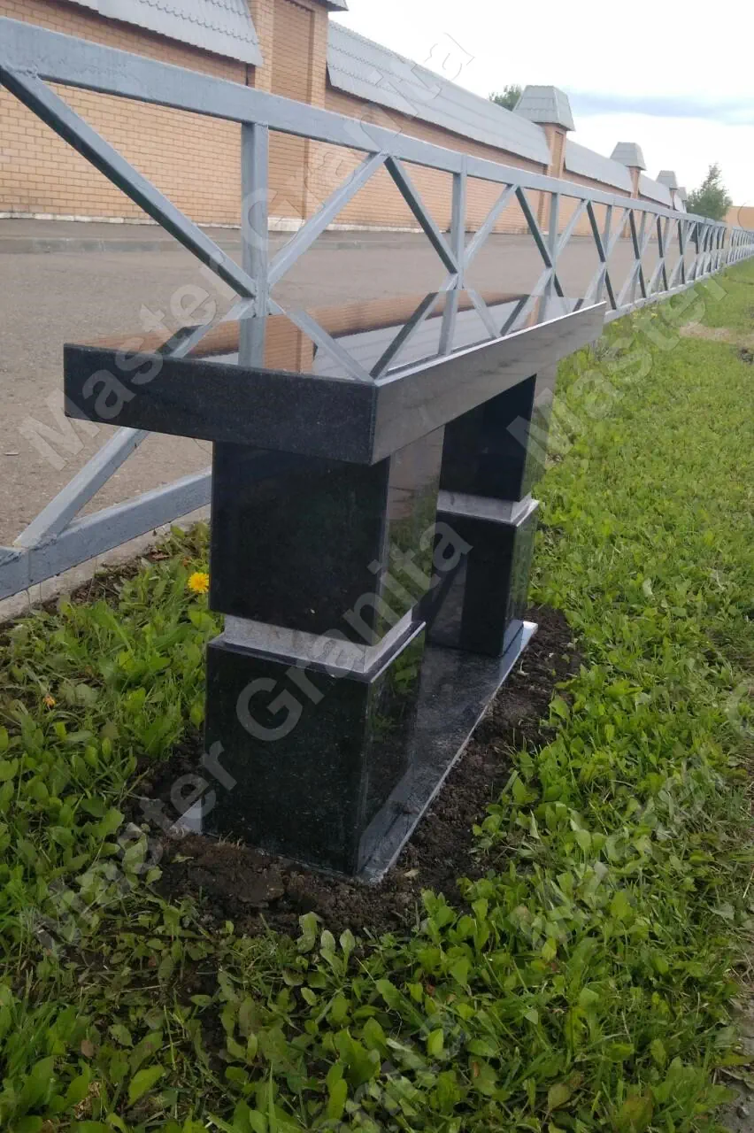 В данном комплексе акцент сделан на воздушность и элегантность форм. Стела состоит из двух резных деталей, которые размещены на необычной подставке. Цоколем выступают мощные перила на столбах, выполняющие роль скамьи. А внутри участка используется белоснежная мраморная крошка.