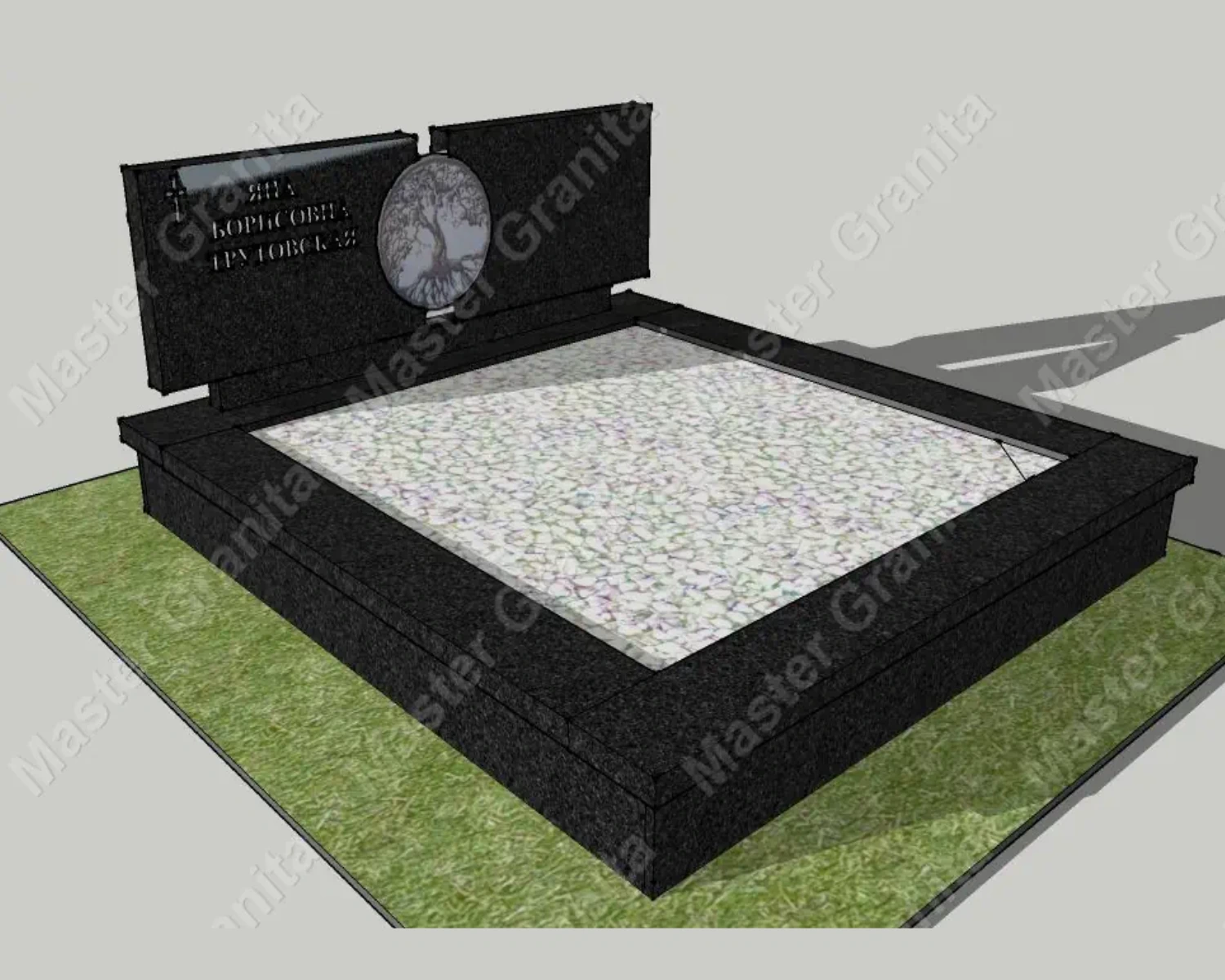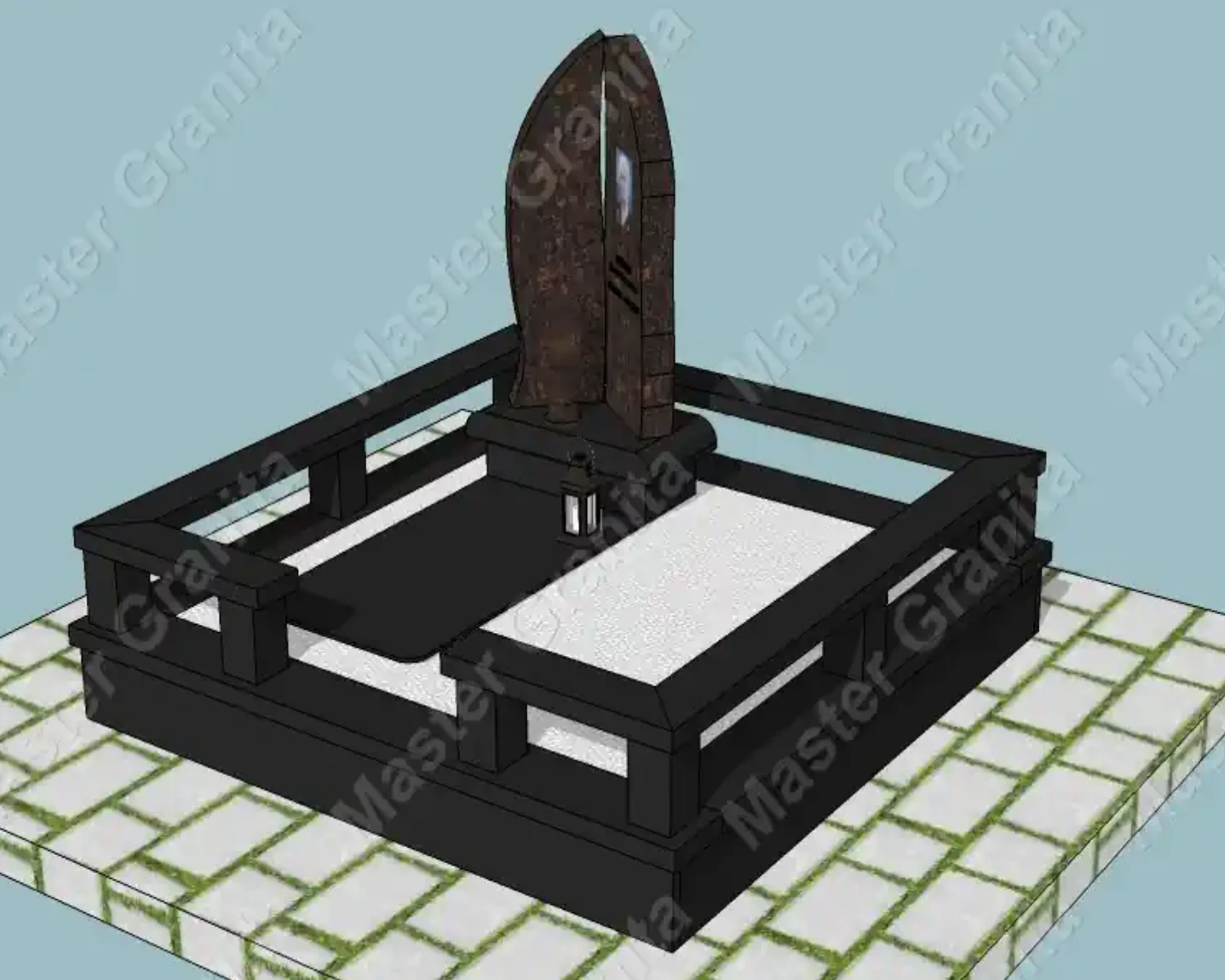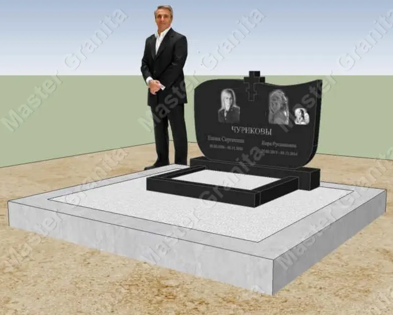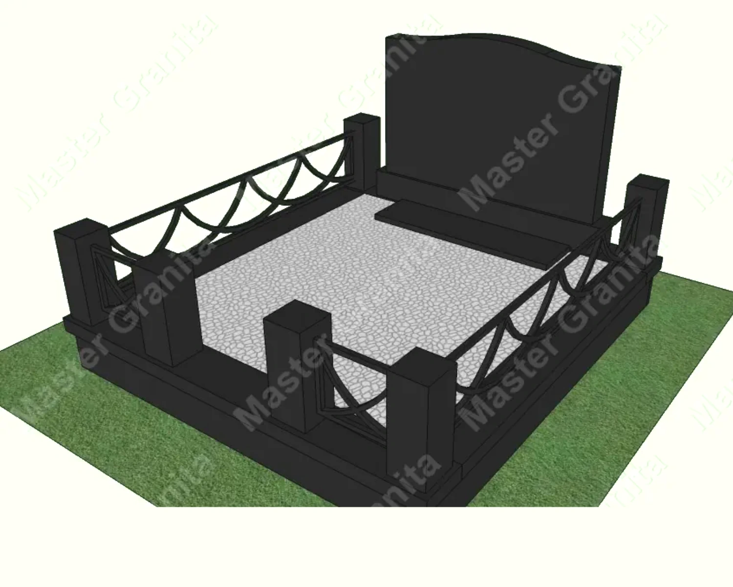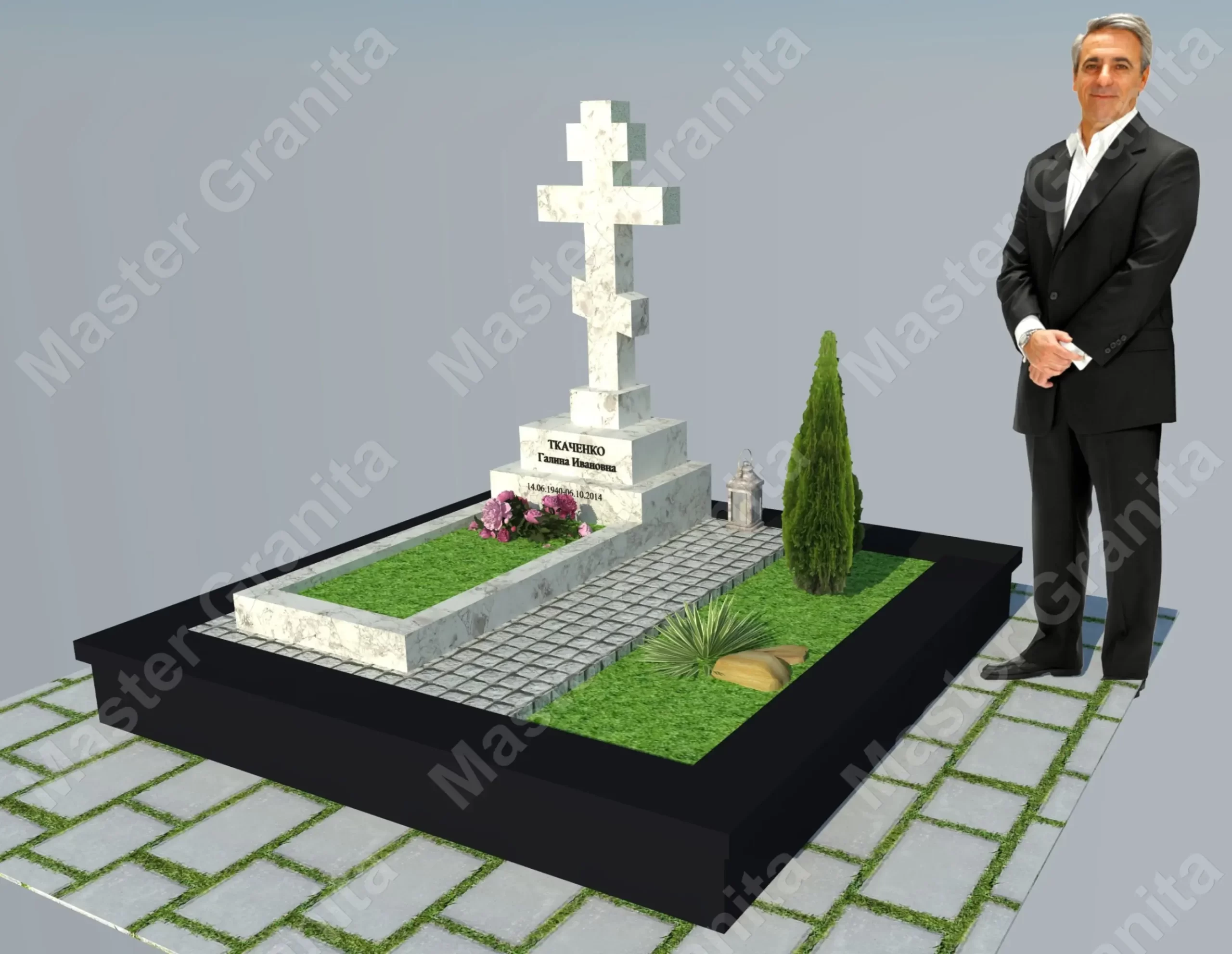 В данном комплексе акцент сделан на воздушность и элегантность форм. Стела состоит из двух резных деталей, которые размещены на необычной подставке. Цоколем выступают мощные перила на столбах, выполняющие роль скамьи. А внутри участка используется белоснежная мраморная крошка.
