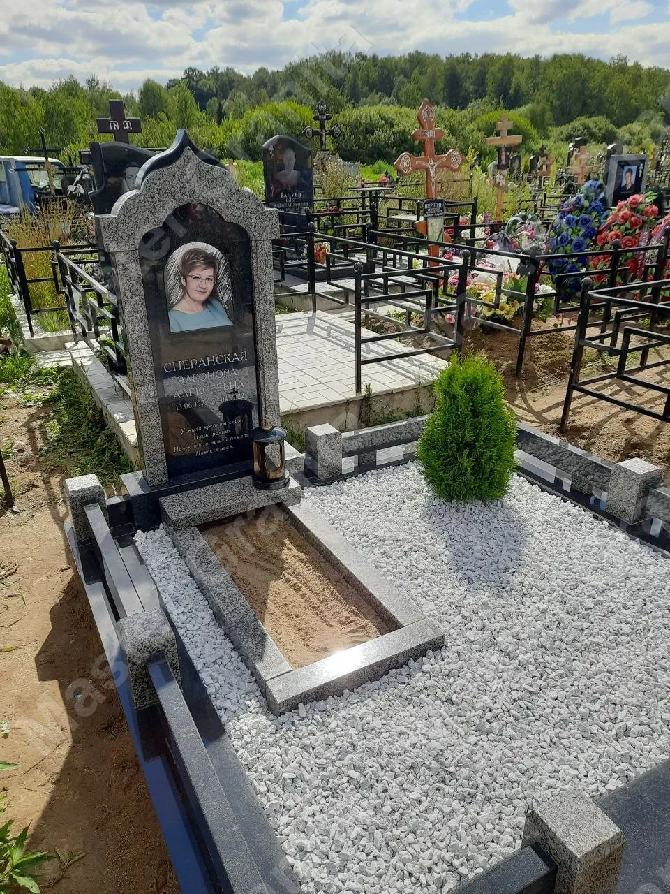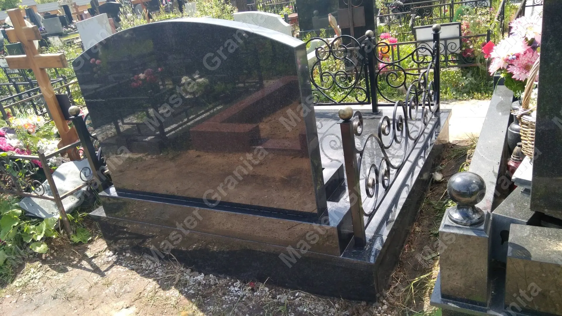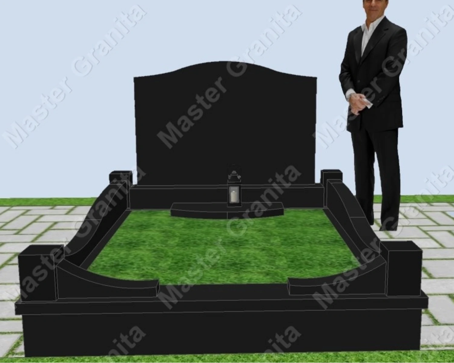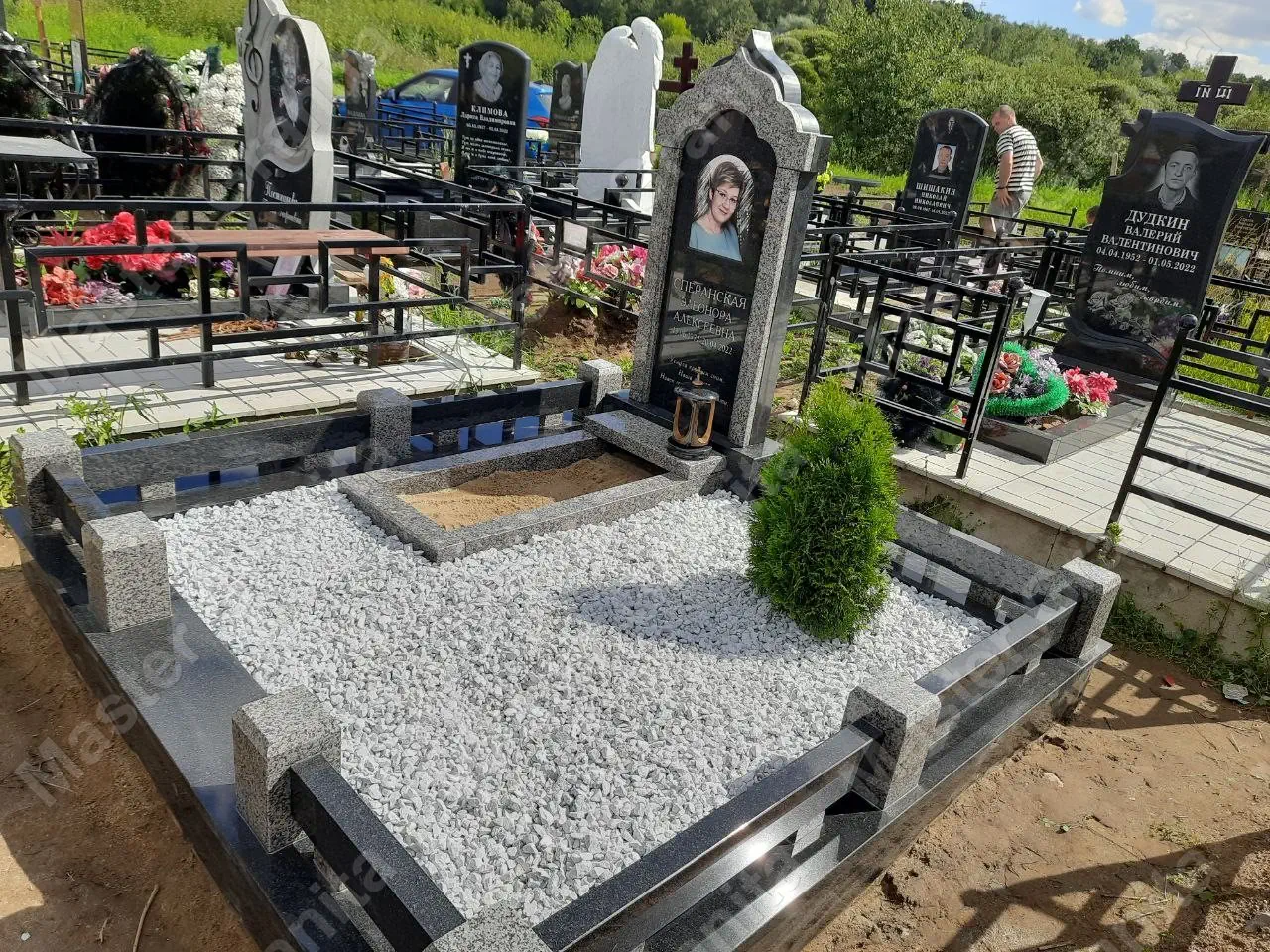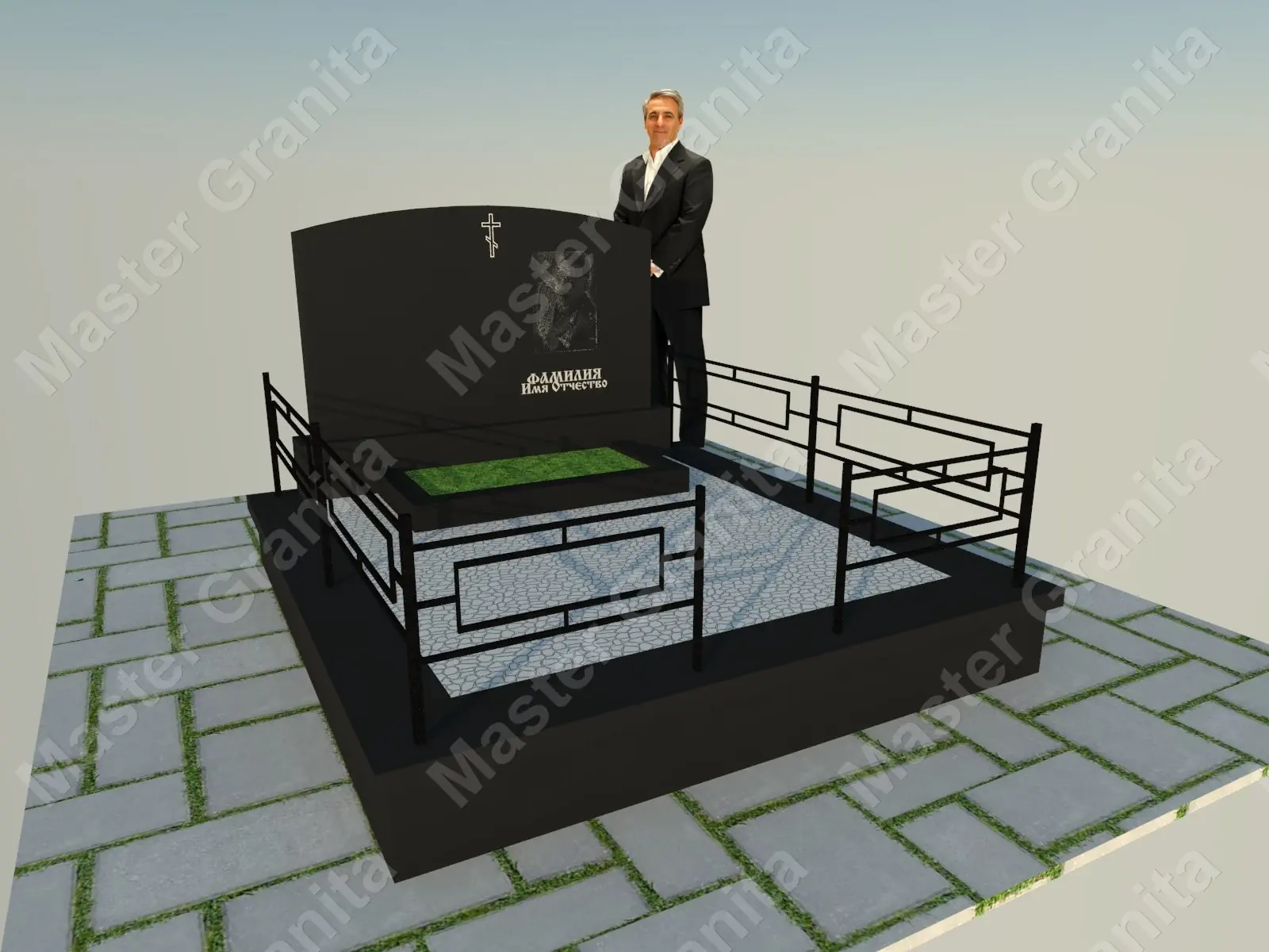 В данном комплексе акцент сделан на воздушность и элегантность форм. Стела состоит из двух резных деталей, которые размещены на необычной подставке. Цоколем выступают мощные перила на столбах, выполняющие роль скамьи. А внутри участка используется белоснежная мраморная крошка.