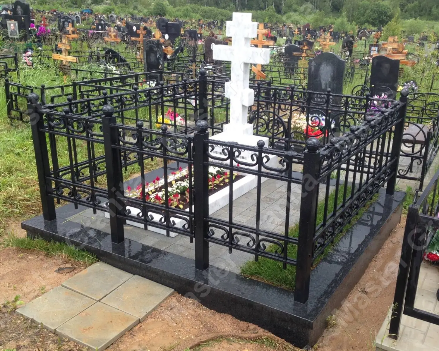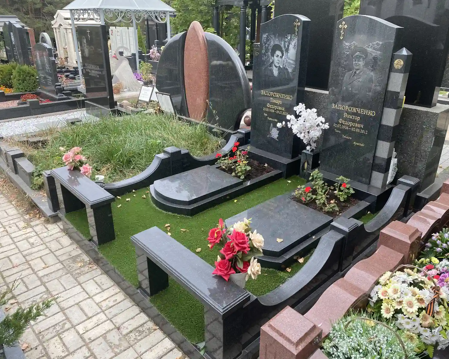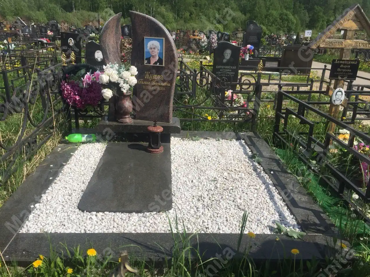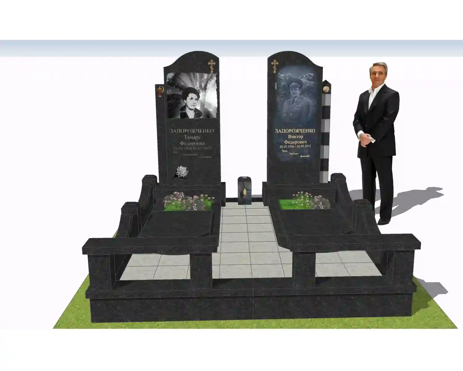 В данном комплексе акцент сделан на воздушность и элегантность форм. Стела состоит из двух резных деталей, которые размещены на необычной подставке. Цоколем выступают мощные перила на столбах, выполняющие роль скамьи. А внутри участка используется белоснежная мраморная крошка.