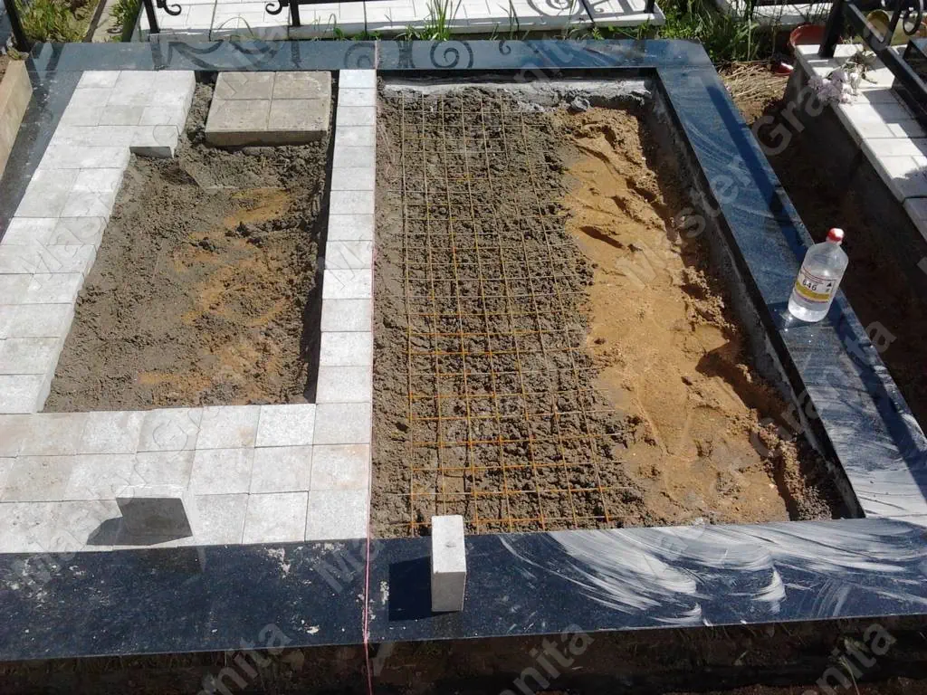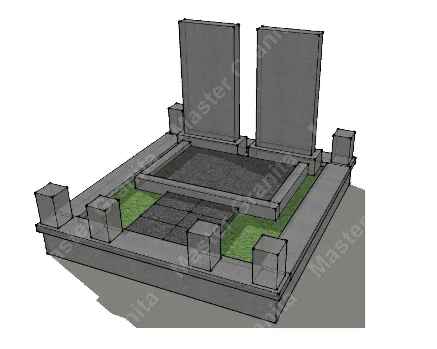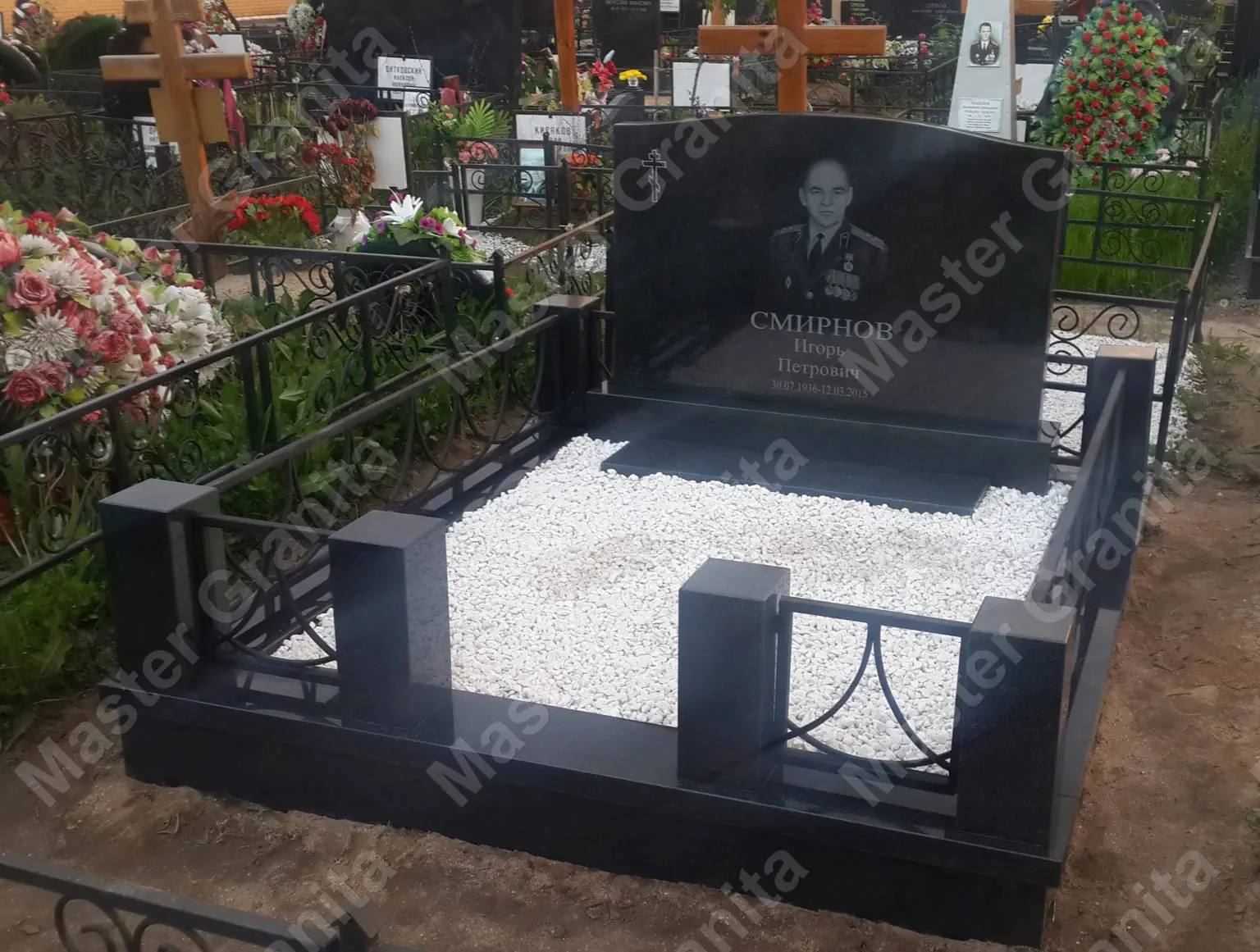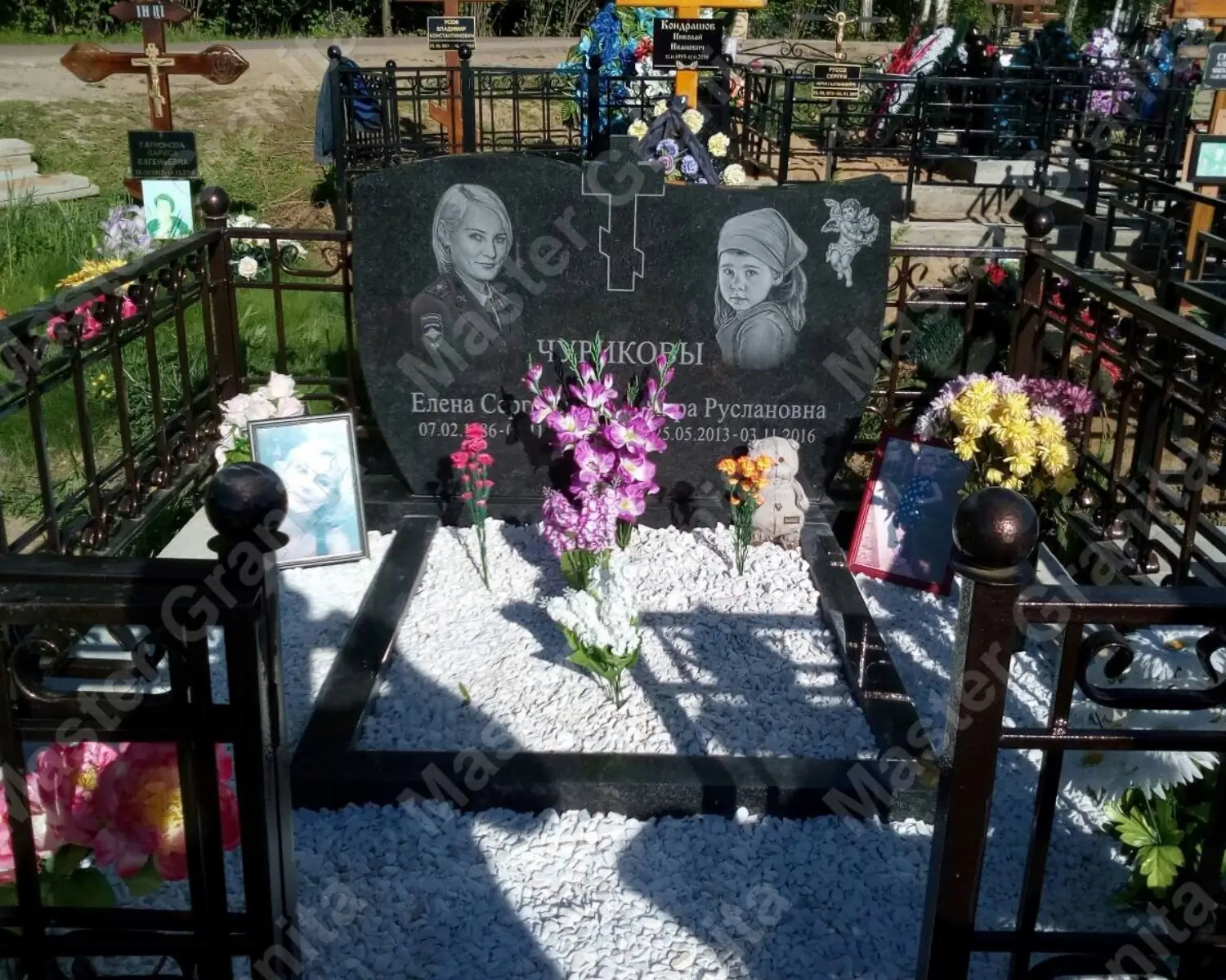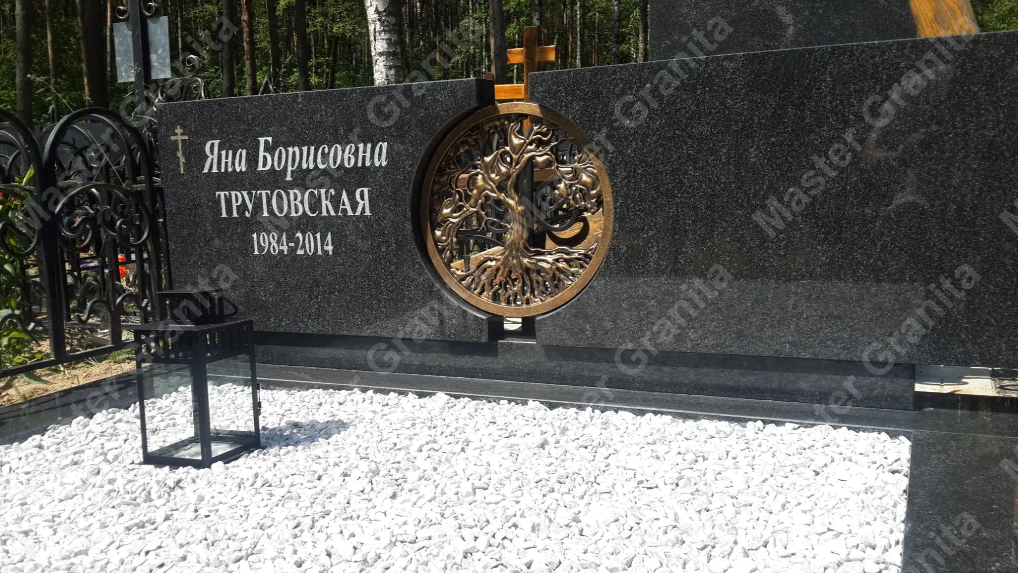 В данном комплексе акцент сделан на воздушность и элегантность форм. Стела состоит из двух резных деталей, которые размещены на необычной подставке. Цоколем выступают мощные перила на столбах, выполняющие роль скамьи. А внутри участка используется белоснежная мраморная крошка.