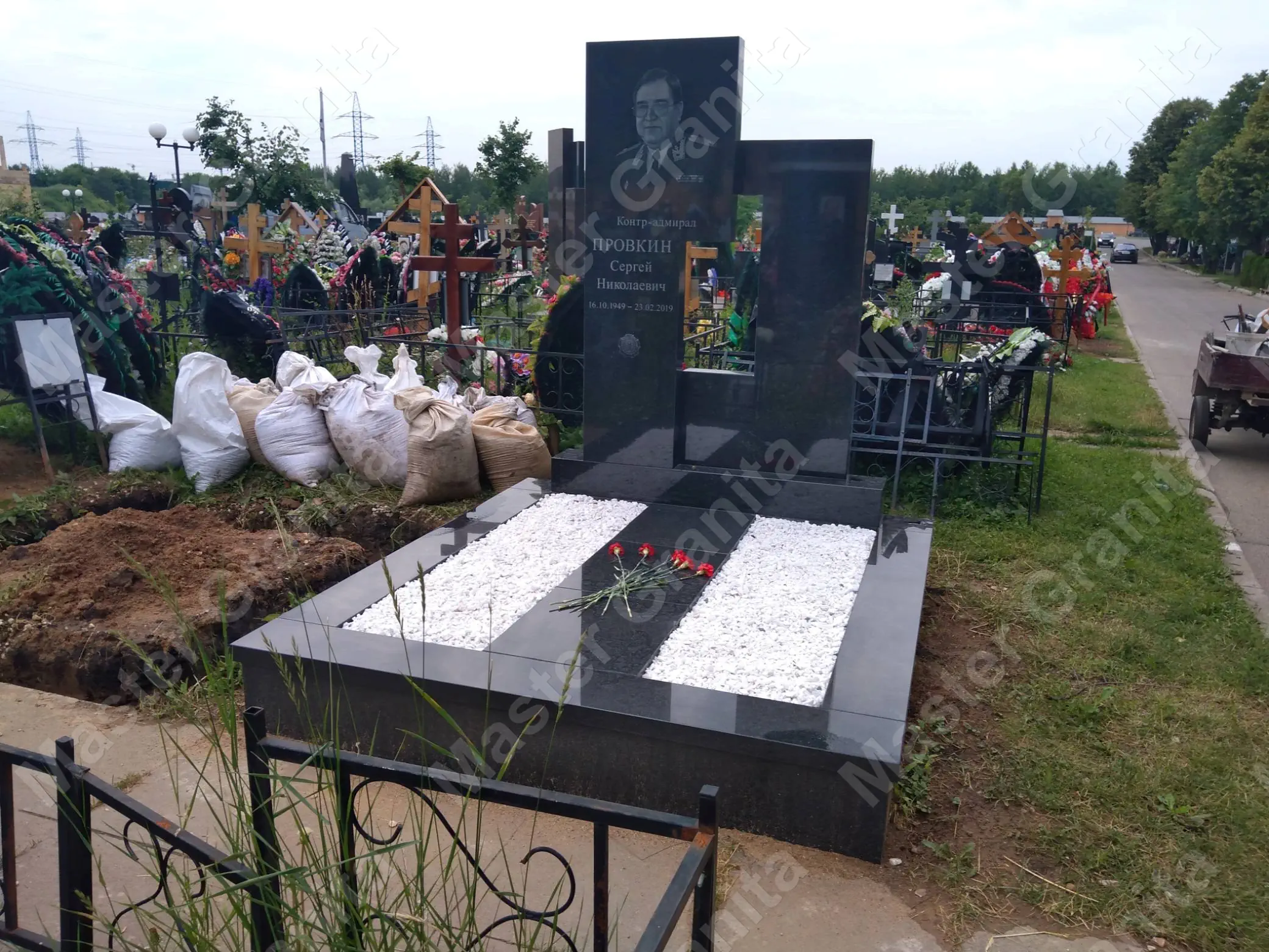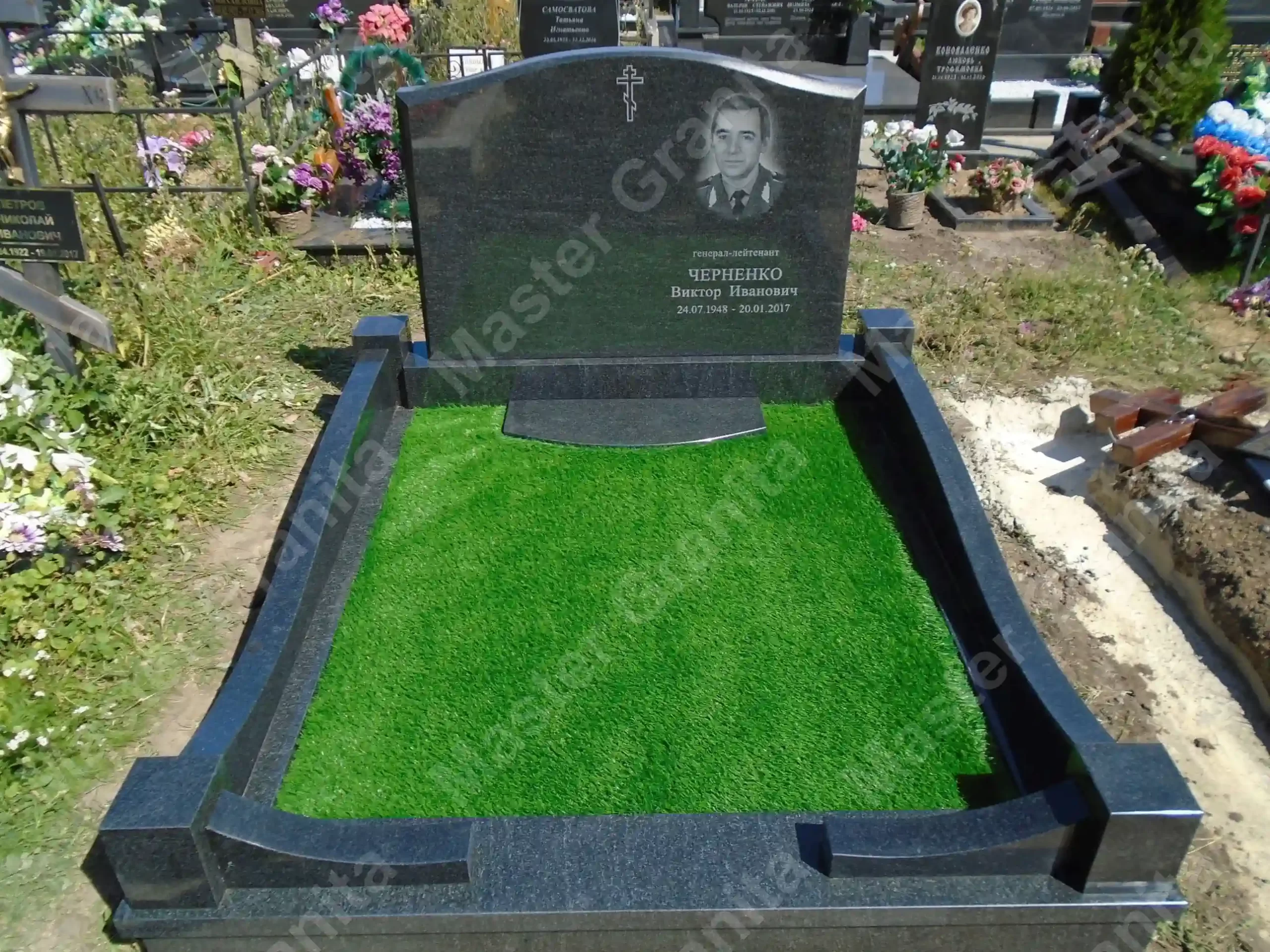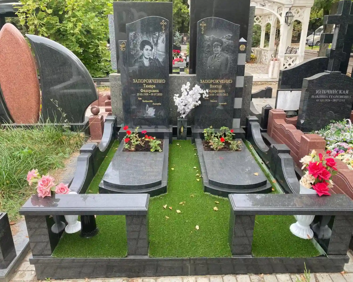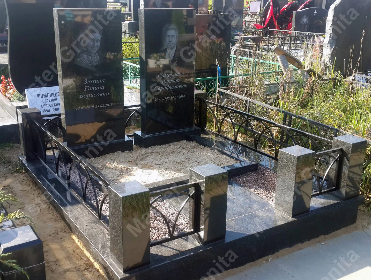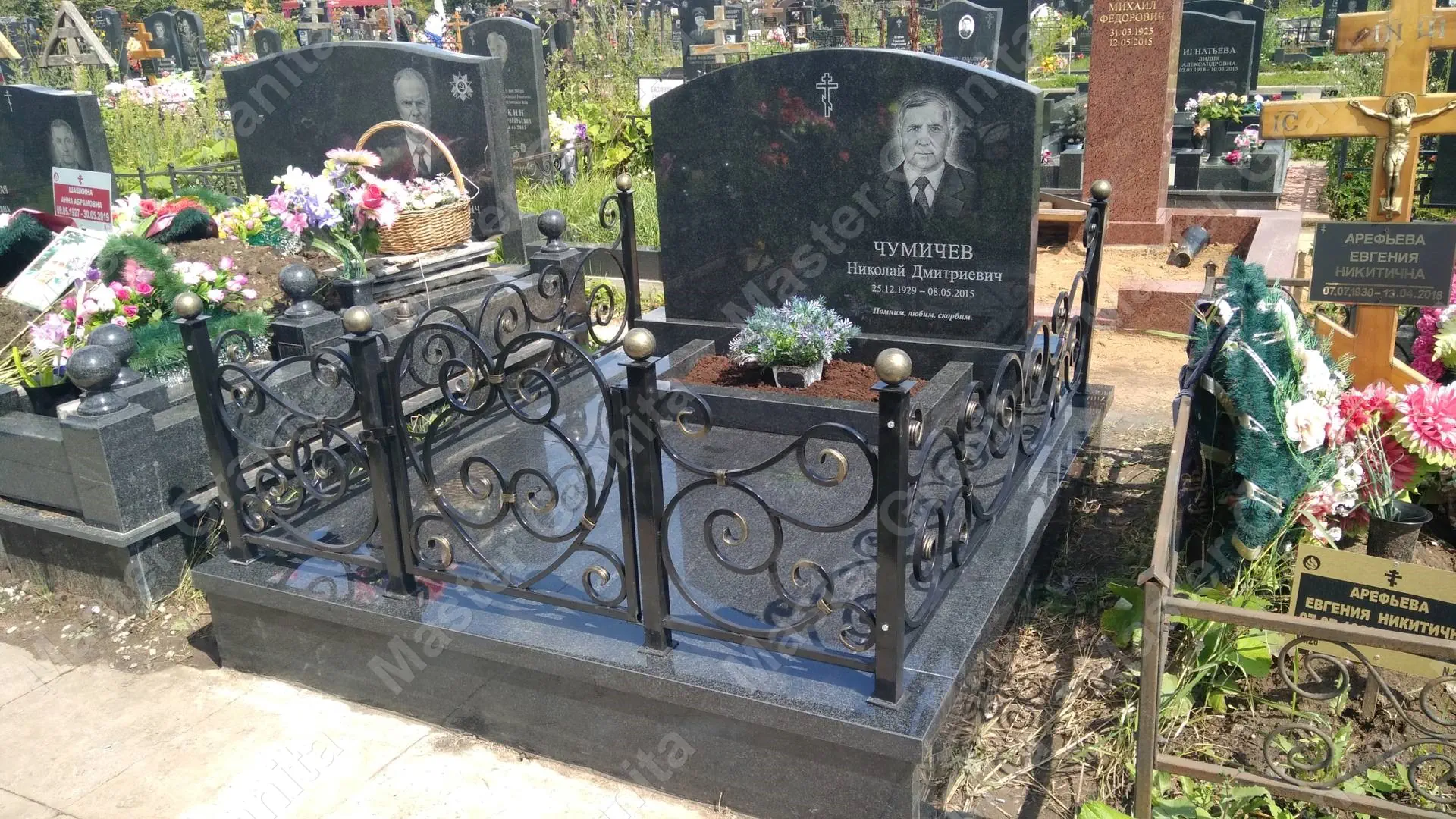 В данном комплексе акцент сделан на воздушность и элегантность форм. Стела состоит из двух резных деталей, которые размещены на необычной подставке. Цоколем выступают мощные перила на столбах, выполняющие роль скамьи. А внутри участка используется белоснежная мраморная крошка.