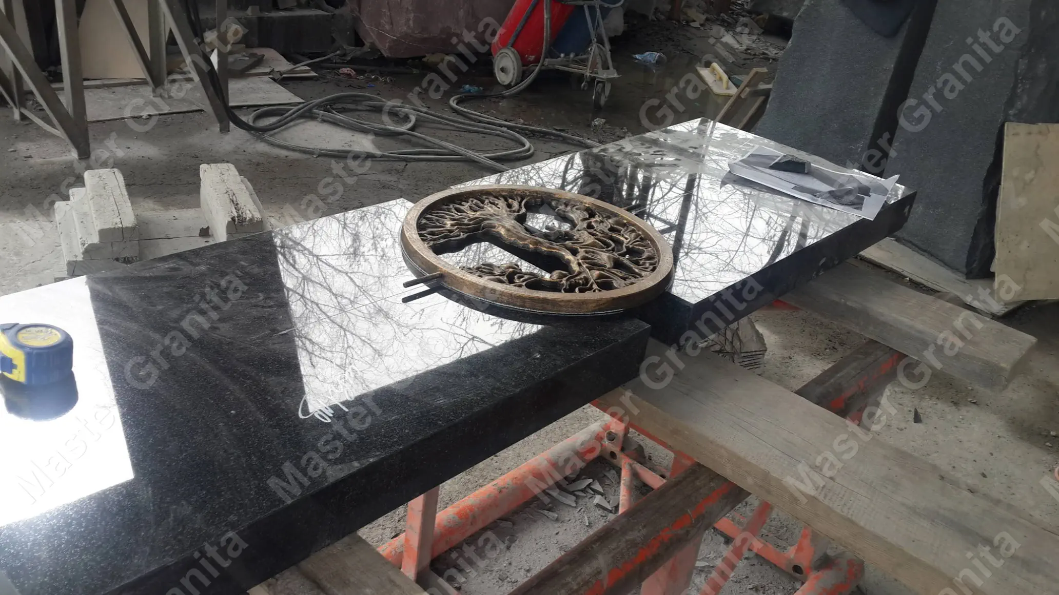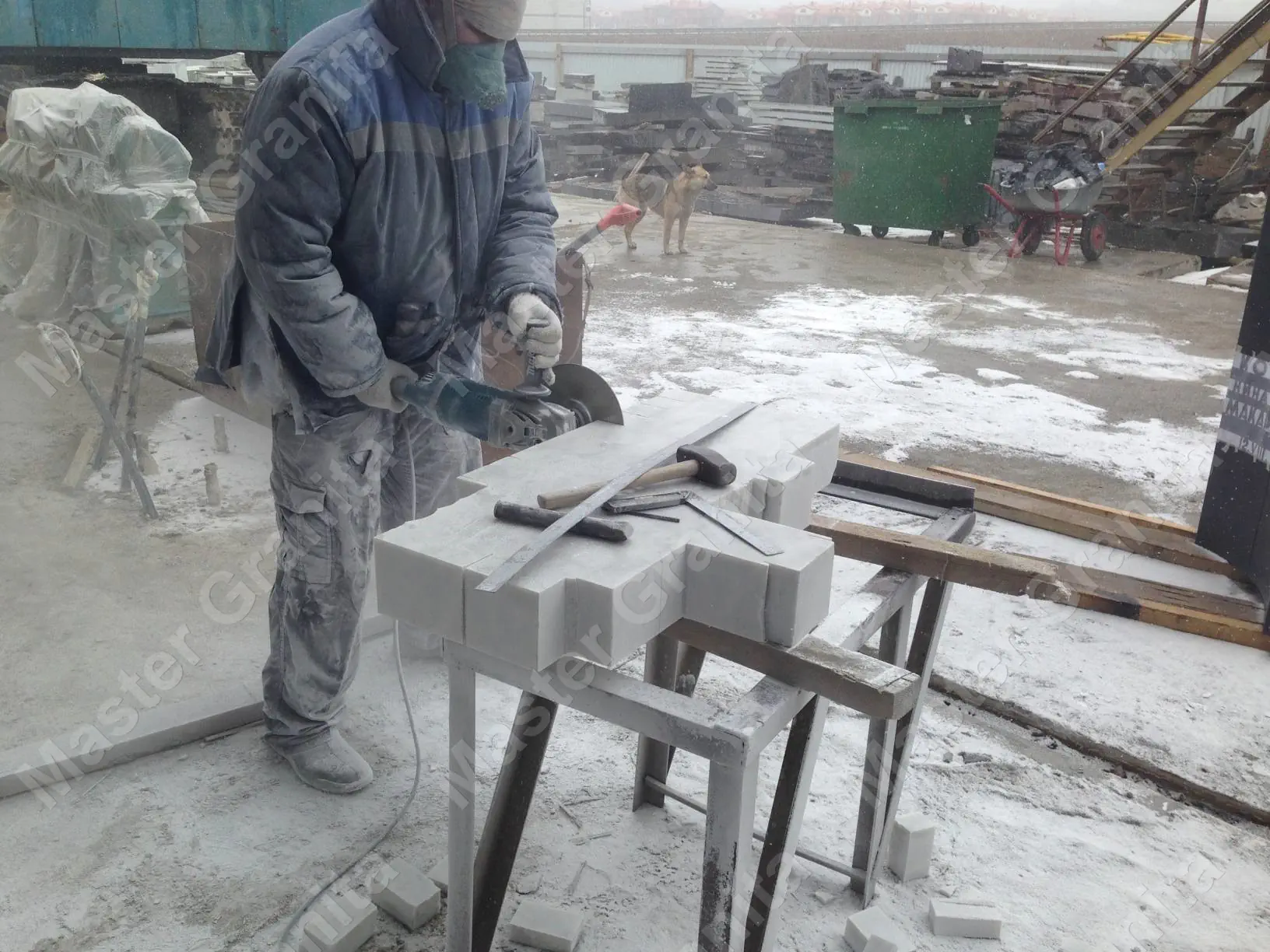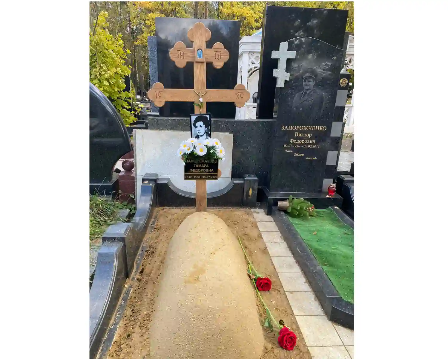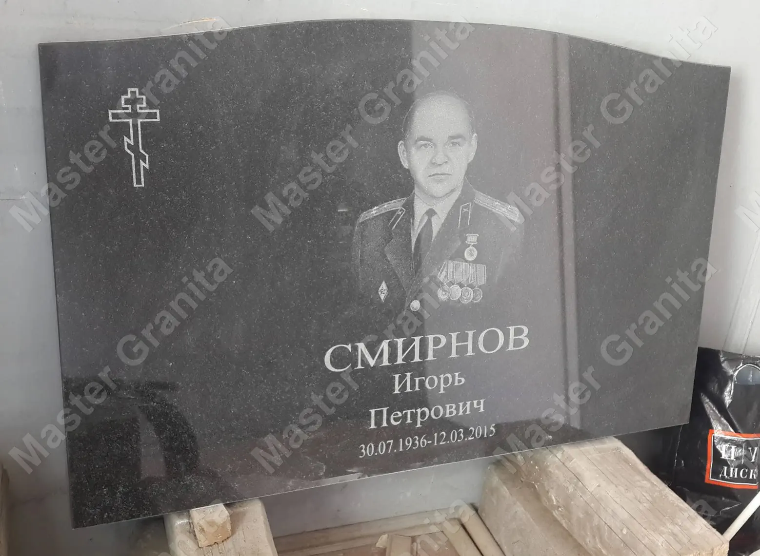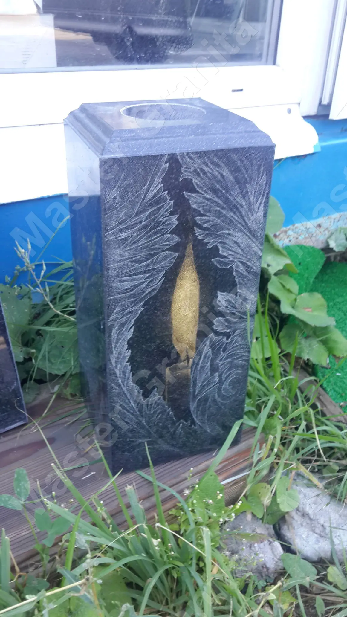 В данном комплексе акцент сделан на воздушность и элегантность форм. Стела состоит из двух резных деталей, которые размещены на необычной подставке. Цоколем выступают мощные перила на столбах, выполняющие роль скамьи. А внутри участка используется белоснежная мраморная крошка.
