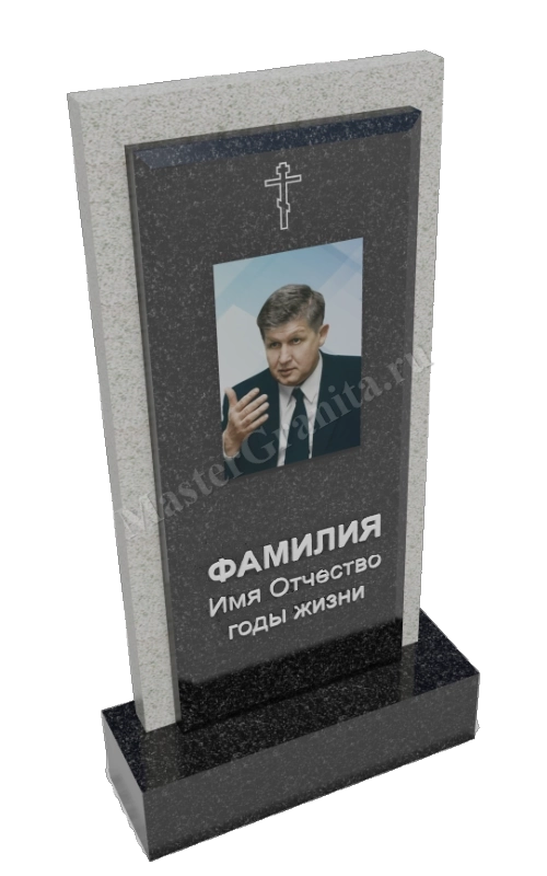 Комбинированный памятник из двух стел. Главная стела с фаской с 3 сторон, а дополнительная стела сзади отличается материалом и создает отступы по 5см с каждой стороны, что добавляет объема в композицию, а так же акцентирует внимание на портрете.